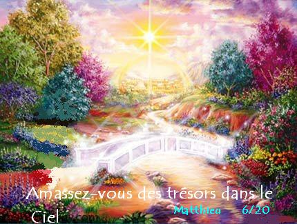 "Amassez-vous des trésors dans le ciel, ou ni la mite ni la rouille ne détruisent et ou les voleurs ne font pas effraction ni ne dérobent ". Matthieu 6/20