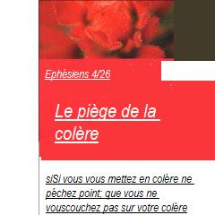 Dieu quand à lui peut se mettre en colère, car la colère ne pourra jamais le sbmerger. Dieu est parfait et il n'y a aucune faillite dans sa natiure. jésus quand à lui montra un vif mécontentement quand il découvrit due le temple de son Père devenait une maison de trafics. Jésus fut-il entrainé par sa colère Manquat-il de maitrise? Loin de là. En cherchant àrifier le temple de Dieu il témoigna des sentiments divins qui l'animaientquand à son Dieu. D'ailleurs en le voyant faire de la sorte,il se souvinrent d'une prophétie qui annonçait ce jour qui manifesterait un zèle dévorant.Ne confondons zèle et colère.