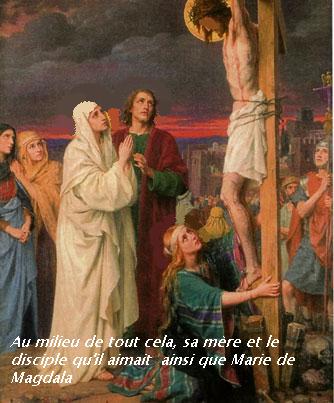 Puis au milieu de tout cela sa mère et le disciple qu'il aimait se tenaient à ses pieds.