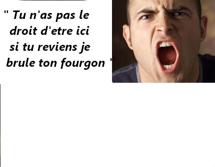 A la fin du marché, alors que la plupart des forains sont déjà partis, il s'approche et laisse éclater sa colère:" Tu n'as pas le droit d'etre ici; si tu reviens je brulerai ton fourgon ".